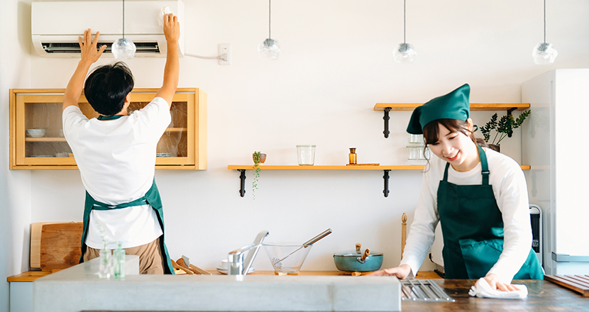 定期的なクリーニングで運転効率もアップします。洗浄後は、熱交換器やフィルターなど1つひとつに抗菌・防カビ処理を施し、丁寧に仕上げます。